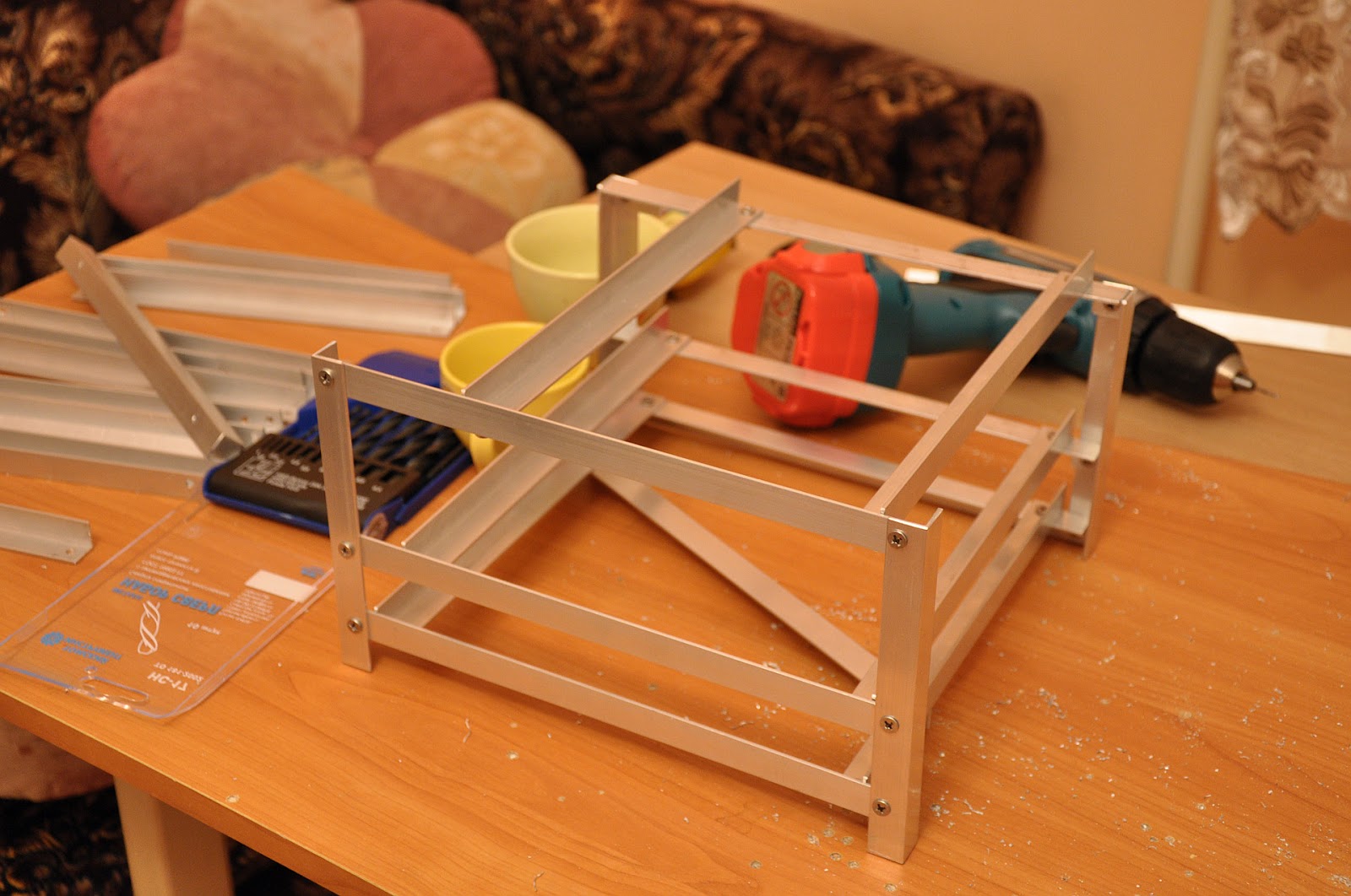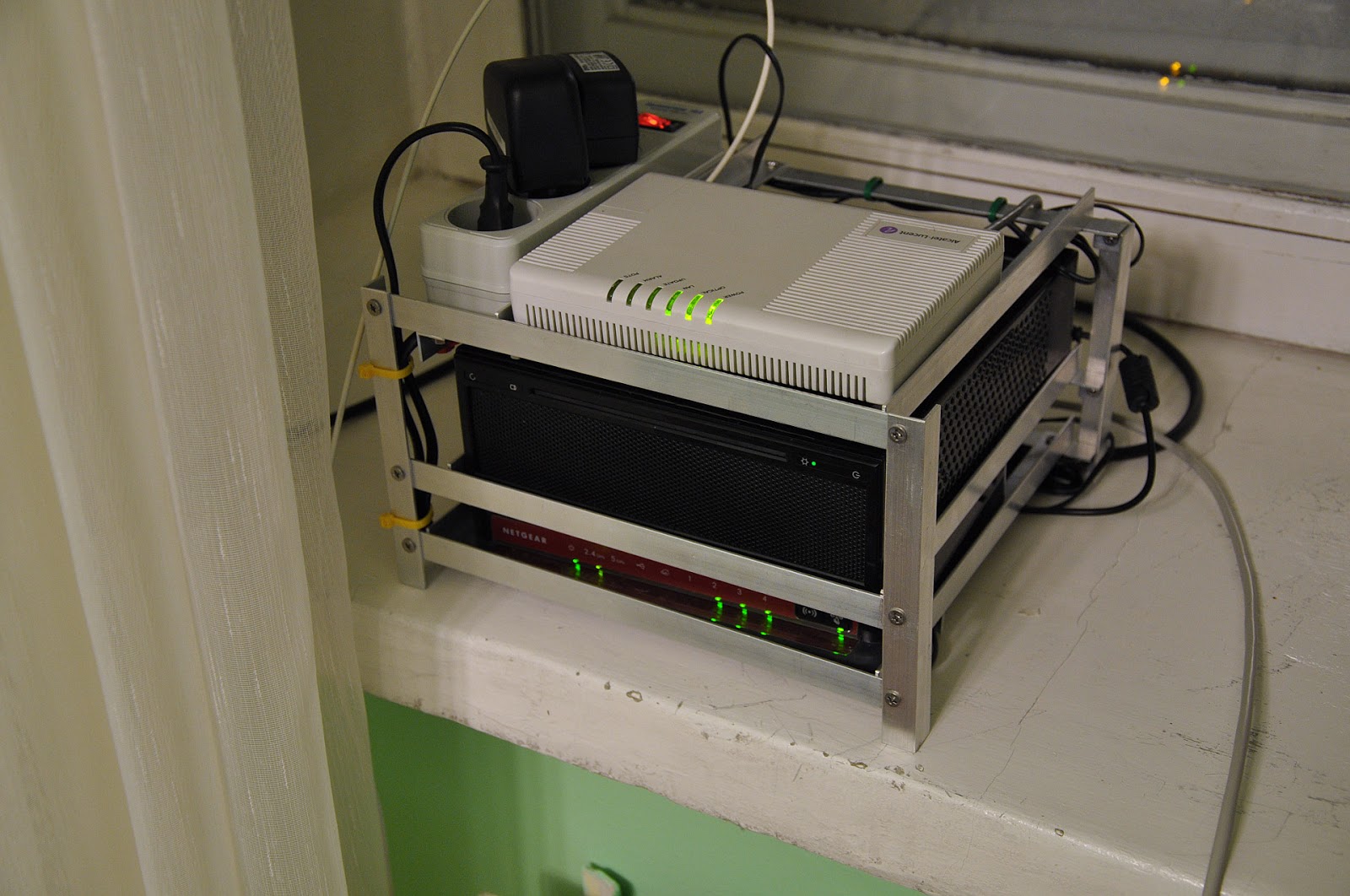 Вышло так, что весь подоконник оказался занят: три аппарата, попарно связанные между собой кабелями, провода от блоков питания, клубки длинных патч-кордов. Захотел я всё это хозяйство уплотнить. Приобрёл в хозмаге алюминиевого уголка восемь метров с запасом, горсть болтиков и гаечек, дрель аккумуляторную заодно, и стал собирать стойку.